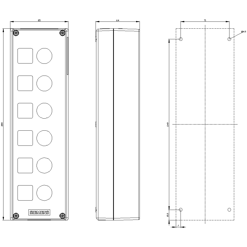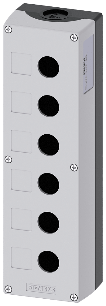 Pulsantiera per dispositivi di comando, 22 mm, rotondo, materiale della custodia plastica, parte superiore della custodia grigia, 6 punti di comando in plastica, approfondimento per etichetta, senza equipaggiamento Custodie SIRIUS ACT per il montaggio dei dispositivi di comando e segnalazione da 22,5 mm in caso di installazione spazialmente separata di unità di comando e quadri elettrici. Siemens offre, sotto il nome commerciale SIRIUS ACT, un portfolio esclusivo di dispositivi di comando e segnalazione con omologazioni di prodotto per il mercato mondiale in tre moderne serie di design in robusto metallo puro e plastica pregiata.L'innovativo concetto di innesto a scatto semplifica talmente il montaggio che per eseguirlo basta una sola mano e non servono attrezzi speciali. Per i fori di montaggio sono sufficienti semplici fori non scanalati, essendo già integrata una protezione antirotazione al 100 %.Grazie al grado di protezione elevato i robusti apparecchi sono adatti all'impiego industriale e in ambiente esterno. È persino possibile la pulizia con getto ad alta pressione. Né polvere, né oli, né liscivia possono comprometterne il funzionamento affidabile.Oltre che con il cablaggio standard, gli apparecchi possono essere collegati al controllore anche tramite PROFINET, AS-Interface oppure IO-Link. Potete così ridurre il vostro onere di cablaggio, minimizzare le fonti di errore e ottenere maggiore flessibilità.Il configuratore online grafico supporta in modo confortevole la scelta e l'ordinazione di singoli apparecchi, pulsantiere e iscrizioni. È disponibile una documentazione completa (ad es. manuale, dati 3D, schema di collegamento). Esecuzioni fornibili: giallo/grigio, plastica/metallo, 1-6 punti di comando, pulsantiera equipaggiabile/equipaggiata, a scelta con collegamento AS-Interface. SIRIUS ACT - Performance in Action nel comando e nella segnalazione. Semplici da montare, altamente performanti, semplicemente perfetti.