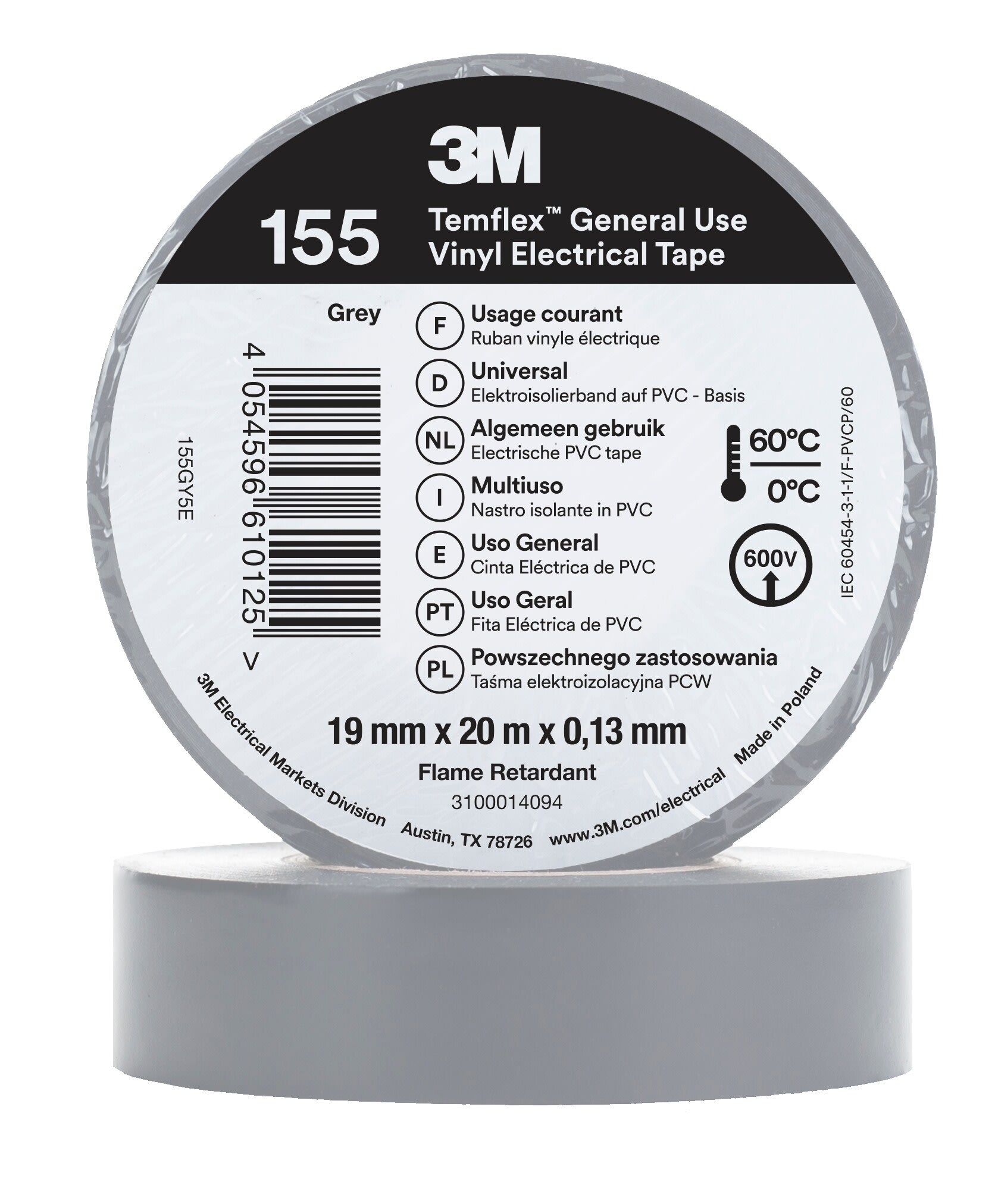 3M - 3M™ Temflex™ Nastro isolante in vinile 155, Grigio, 19 mm x 20 m 7100184740