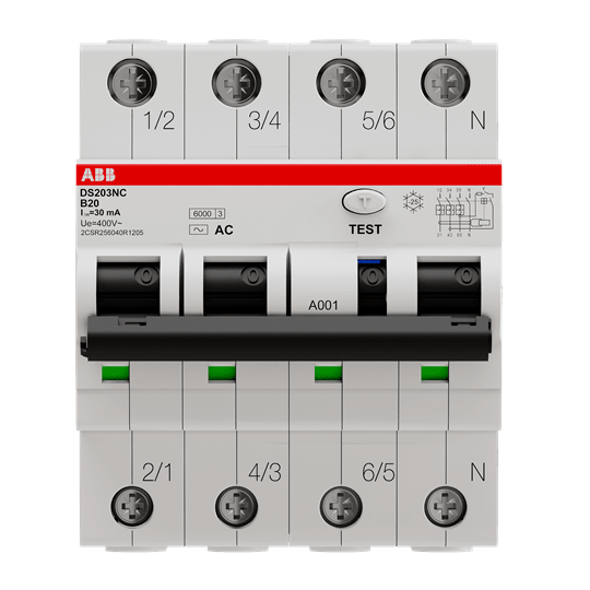 ABB - DS203NC B20 AC30 Residual Current Circuit Breaker with Overcurrent Protection DIFF MAG 6 KA 3P+N 30MA