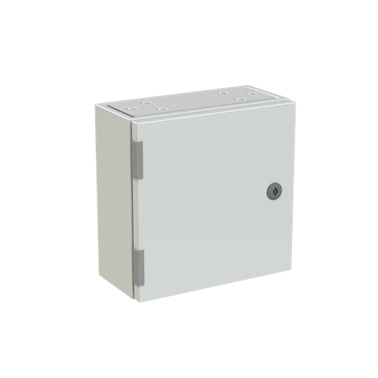 Cassa con porta cieca e piastra di fondo serie sr2, struttura in lamiera d'acciaio spessore 12/10, piastra di fondo in lamiera zincata spessore 20/10. utilizzata per la realizzazione di quadri di comando e controllo delle più varie macchine industriali: da grossi macchinari a linee automatizzate di produzione o parti di esse, alle tipiche installazioni di quadri bordo macchina, a caldaie, impianti di riscaldamento ed altro ancora.