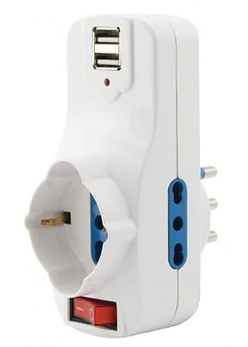 ALPHA ELETTRONICA - Adattatore da spina 3 poli 16A girevole a 1 presa Universale Italia P40 e 2 Italia bipasso 10-16A - Interruttore e 2 prese USB 5V - 1A