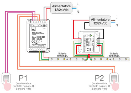 Grazie all'amplificatore per strisce led digitali ALC024 potrai creare effetti di luce lineari con accensione e spegnimento progressivi comandati dal controller master ALC244 con lunghezza superiore a 5m.