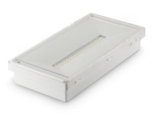 Lampada di illuminazione di emergenza a led dal design compatto e minimale installabile a parete o soffitto.