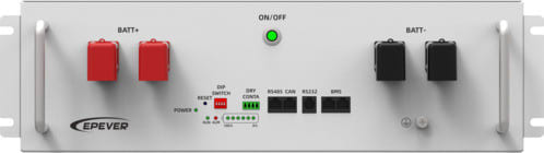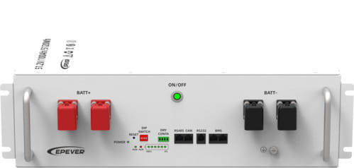 BLF-E51100R è la batteria Epever al litio LiFePO4 a stato solido ad alta capacità da 51,2 V e 100 Ah con display LCD, che offre 6000 cicli, design modulare, installazione su rack e protezione IP65 per l'accumulo di energia.