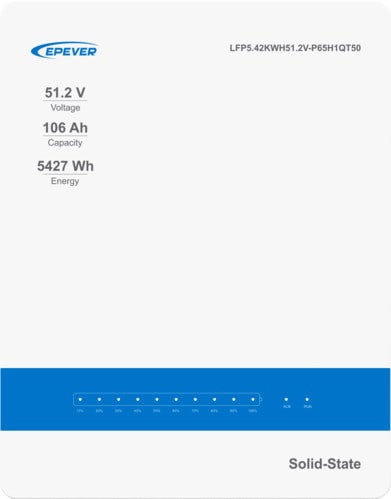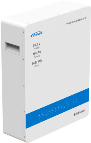 La batteria BLF-E51106LW Epever è una batteria agli ioni di litio allo stato solido LiFePO4 da 51,2 V 106 Ah da montaggio a parete con display LED, protezione IP65 e 5000 cicli. Ideale per i sistemi di accumulo di energia.