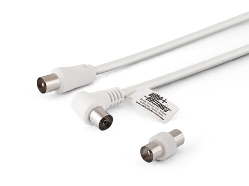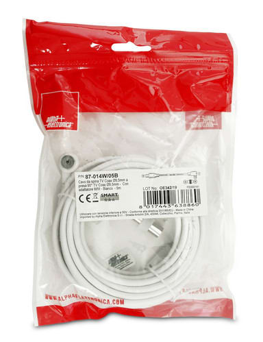 ALPHA ELETTRONICA - Cavo da spina TV Coax Ø9,5mm a presa 90° TV Coax Ø9,5mm - Con adattatore M/M - Bianco - 5m 87-014W/05B