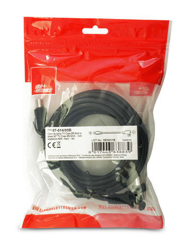 ALPHA ELETTRONICA - Cavo da spina TV Coax Ø9,5mm a presa 90° TV Coax Ø9,5mm - Con adattatore M/M - Nero - 5m 87-014/05B