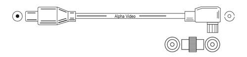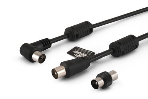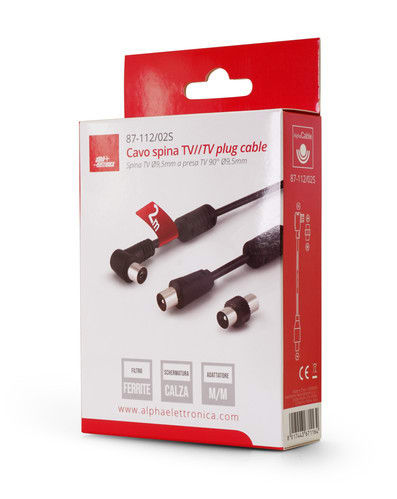 ALPHA ELETTRONICA - Cavo da spina TV Coax Ø9,5mm a presa 90° TV Coax Ø9,5mm - Schermato - Con adattatore M/M - Con ferrite - Nero - 2m 87-112/02S