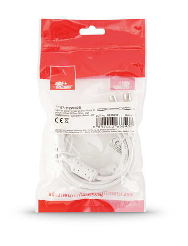 ALPHA ELETTRONICA - Cavo da spina TV Coax Ø9,5mm a presa TV Coax Ø9,5mm - Completamente schermato - Con adattatore M/M - Con ferrite - Bianco - 2m 87-112W/02B