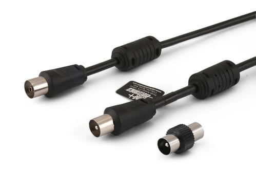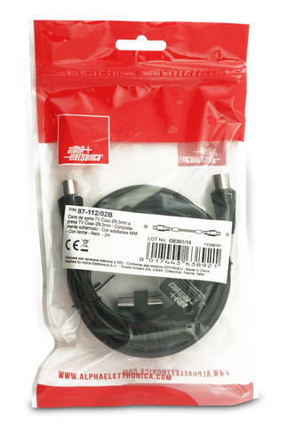 ALPHA ELETTRONICA - Cavo da spina TV Coax Ø9,5mm a presa TV Coax Ø9,5mm - Completamente schermato - Con adattatore M/M - Con ferrite - Nero - 2m 87-112/02B