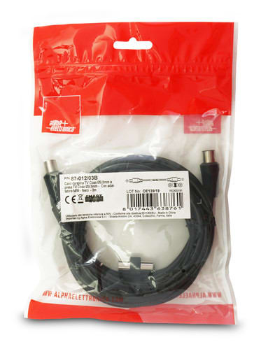 ALPHA ELETTRONICA - Cavo da spina TV Coax Ø9,5mm a presa TV Coax Ø9,5mm - Con adattatore M/M - Nero - 3m 87-012/03B