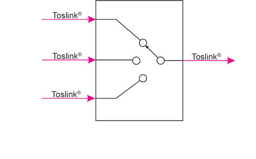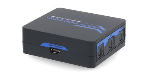 Questo commutatore per segnali audio ottici digitali con connettori Toslink consente di collegare tre sorgenti a un amplificatore audio.