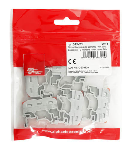 ALPHA ELETTRONICA - Connettore rapido serrafilo - un polo passante - 2 morsetti - Per barra guida DIN 542-21