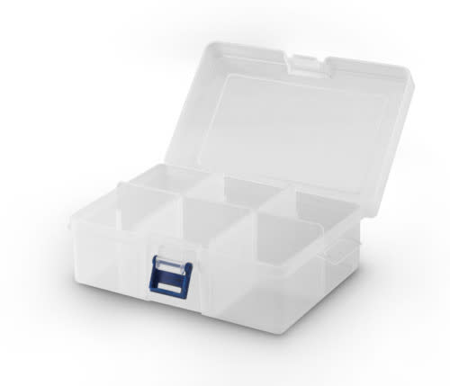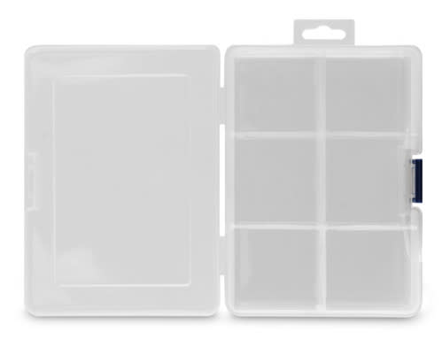 Scatola di assortimento trasparente con 1-6 divisori regolabili. Una chiusura a cerniera.