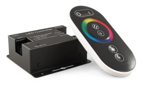 Il telecomando touch con rotella multicolore RF consente il controllo dei colori RGB, dell'intensità luminosa, dei modi di funzionamento oltre che il controllo on/off delle sorgenti led collegate.