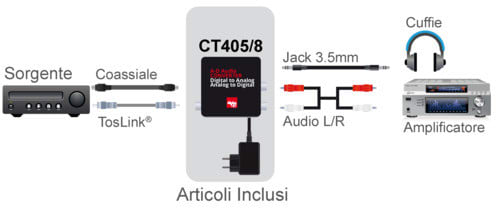- Analogico-Digitale: converte audio L/R o analogico in audio Coax o TOSLINK
