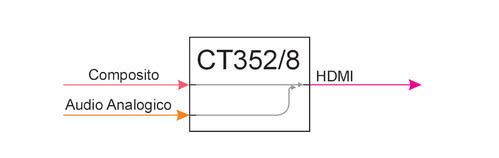 Il convertitore CT352/8 é sviluppato per effettuare la conversione di un segnale video analogico Composito (AV - CVBS) verso unuscita HDMI.