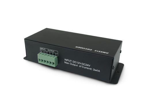 Controller Ricevitore DMX, permette di decodificare i segnali DMX e pilotare tramite PWM nastri Led e altre sorgenti luminose a bassa tensione dimmerabili.