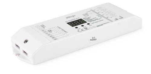 Permette di controllare tramite DMX colore e luminosità di faretti RGBW (RGB+Bianco) o nastri led RGB + nastri led bianchi.