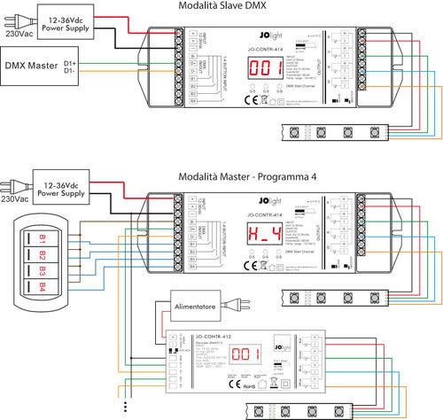 Nella modalità Master DMX, dai morsetti D+ e D- verrà trasmesso un segnale DMX che potrà essere portato ad ulteriori decoder JO-CONTR-412 e permetterà di replicare gli stessi colori o giochi di luci presenti sulle uscite PWM del JO-CONTR-414.