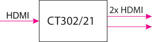 Il distributore di segnale CT302/21 suddivide lingresso HDMI in 2 uscite per inviare il segnale sorgente in ingresso ad altrettante uscite. Le due uscite sono amplificate ed equalizzate per ottenere le migliori prestazioni.