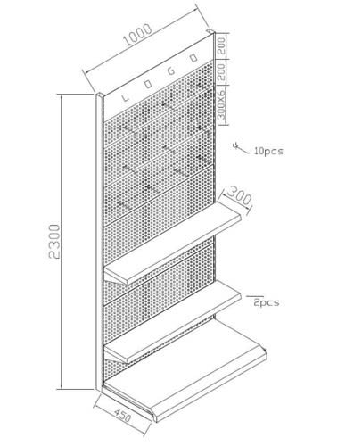 Espositore da terra 230x100x45cm con mensole e ganci