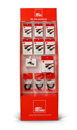 Pratico espositore da terra realizzato per favorire l'esposizione di cavi HDMI a antenna TV in tutti i punti vendita.