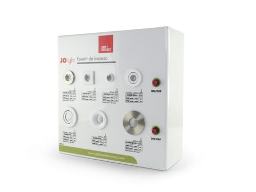Elegante espositore da banco composto da un'assortita campionatura di faretti da incasso led della gamma JO390.