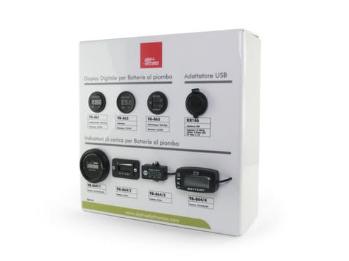 Elegante espositore da banco composto da un'assortita campionatura di display e indicatori per batterie al piombo.