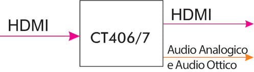 L'estrattore CT406/7 permette l'estrazione del segnale audio in due modalità: ottico digitale (Toslink SPDIF) e analogico (Stereo 3,5mm) a partire da un segnale HDMI (audio-video) in ingresso. L'uscita HDMI passante mantiene pieno supporto del segnale entrante.
