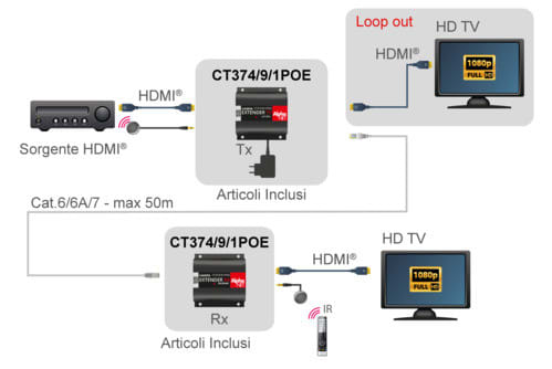 ALPHA ELETTRONICA - Extender HDMI - 1080p - 3D - IR - Loop-Out - PoC - EDID - cavo CAT.6 - 50 m CT374/9/1POE