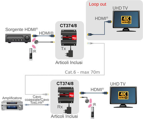 ALPHA ELETTRONICA - Extender HDMI® - 4K - IR bidirezionale - Loop-Out - HDR - ARC - cavo Cat.6 - 70m CT374/8