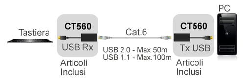 L'extender CT560 consente la trasmissione del segnale tramite un cavo Cat.5e/Cat.6 (non incluso) fino ad una distanza massima di 50m per i dispositivi USB 2.0.