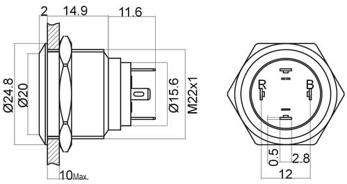 ALPHA ELETTRONICA - Indicatore Led da pannello - Ottone - 24V - morsetto a saldare - Rosso/Blu - Foro ø22mm LL9069-03-15S