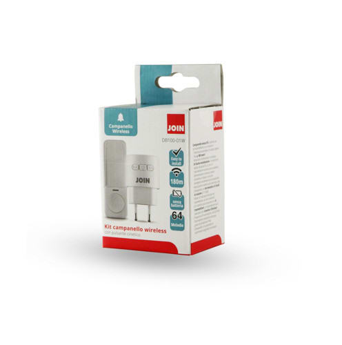 Il kit campanello senza fili DB100-01 è costituito da un pulsante trasmettitore e un campanello ricevitore.