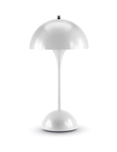 Lampada da tavolo a LED a batteria. Interruttore Touch nella parte superiore. Emissione di luce calda verso il basso. La lampada integra una batteria agli ioni di litio per una durata della carica maggiore. Disponibile in versione bianca, azzurra e arancio.
