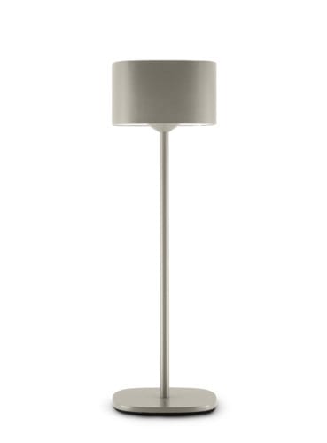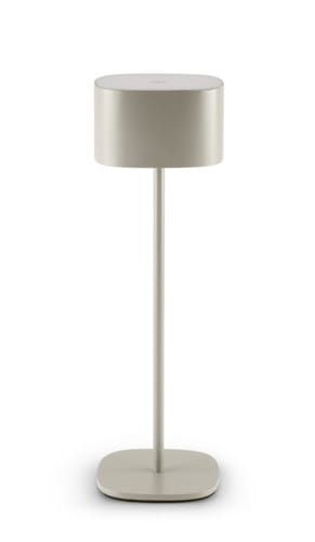 Lampada da tavolo a LED a batteria. Interruttore Touch illuminato nella parte superiore. Emissione di luce calda verso il basso. La lampada integra una batteria agli ioni di litio per una durata della carica maggiore. Disponibile in versione bianca, caffè, sabbia e verde petrolio.