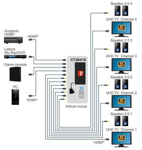 La matrice HDMI® CT384/10 permette la connessione di 4 sorgenti HDMI® a 4 uscite video come TV o monitor permettendo la scelta di qualunque ingresso per ogni uscita.