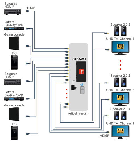 La matrice HDMI® CT384/11 permette la connessione di 8 sorgenti HDMI® a 8 uscite video come TV o monitor permettendo la scelta di qualunque ingresso per ogni uscita.
