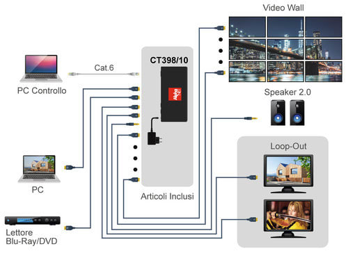 La matrice HDMI® CT398/010 permette la connessione di 2 sorgenti HDMI® a 2 uscite loop-out HDMI® e a 9 uscite video wall con scaler, permettendo la scelta di qualunque ingresso per ogni uscita.