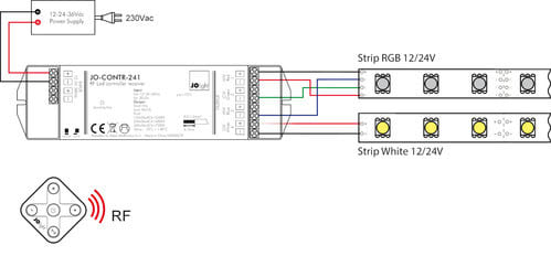 Il telecomando JO-CONTR-236P, utilizzato con gli appositi ricevitori di Alpha Elettronica opportunamente connessi ad una striscia led RGBW oppure ad una striscia led RGB ed una bianca, consente tramite il tasto RGB la miscelazione dei vari colori RGB e del bianco tramite il tasto W. Inoltre è possibile regolare lintensità (dimmer) della luce alla colorazione scelta tramite i tasti funzione.