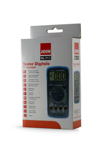 Grandezze misurabili: Tensione DC, Tensione AC, Corrente DC, Corrente AC, Resistenza, Capacità, Frequenza, Temperatura, HFE, Prova diodi