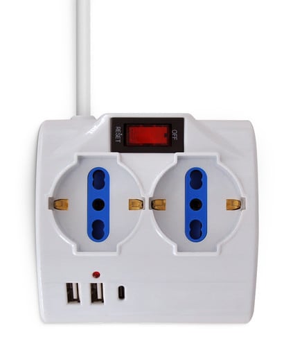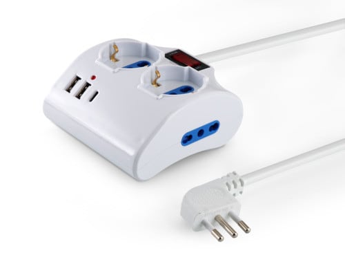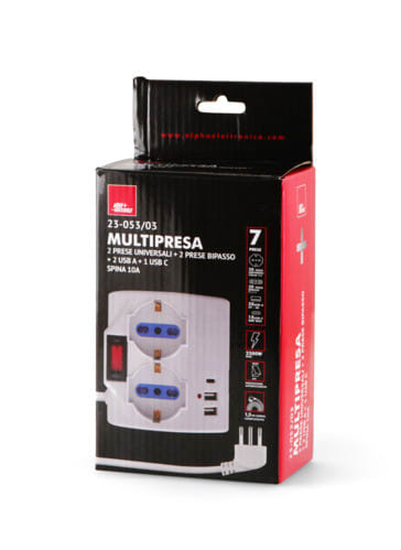 ALPHA ELETTRONICA - Multipresa da tavolo con 2 prese Universali Italia P40 e 1 Italia bipasso 10/16A - Interruttore - Cavo 1,5m - Spina 10A a 90° - 2 USB A e 1 USB C - P 23-053/03