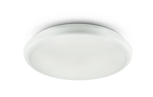 Emissione diffusa. Base bianca in materiale plastico e diffusore in policarbonato opale con montaggio a scatto.