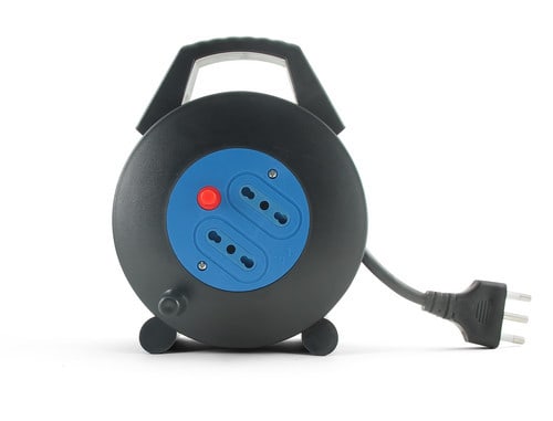 Prolunga avvolgibile da 5m con maniglia e due prese bipasso 10/16A.