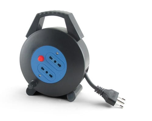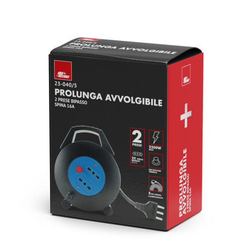Prolunga avvolgibile da 5m con maniglia e due prese bipasso 10/16A.