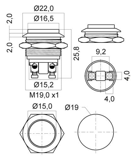 ALPHA ELETTRONICA - Pulsante momentaneo antivandalo ø19mm - 1P - SPST - OFF/(ON) - N.A. - 3A@250Vac - 2 term. vite 330-053