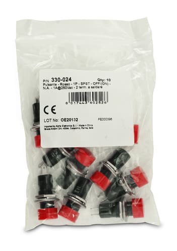 ALPHA ELETTRONICA - Pulsante - Rosso - 1P - SPST - OFF/(ON) - N.A. - 1A@250Vac - 2 term. a saldare 330-024
