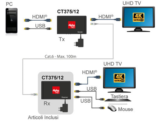 ALPHA ELETTRONICA - Ricevitore per extender HDMI CT375/12 - 4K@30Hz - KVM - Loop Out - Over IP (1:N) - cavo CAT.6 - 100 m - CON PRENOTAZIONE USB CT375/12R