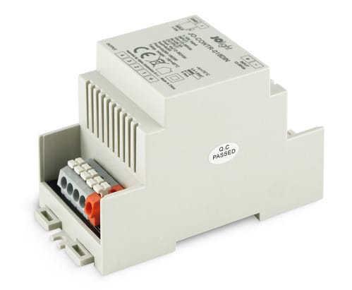 Dimmer 1-10V per barra DIN attraverso il quale è possibile controllare l'accensione automatica e la regolazione di intensità di nastri led, lampade e faretti funzionanti a tensione costante (12, 24 oppure 36Vdc).